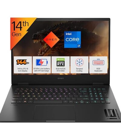 HP OMEN Gaming, 14th Gen Intel Core i7-14650HX, 8GB RTX 4060 (16GB DDR5, 1TB SSD) FHD, 144Hz, IPS, 16.1-inch (40.9 cm) Win11, Office21, Black, 2.39 kg, wf1150TX, RGB KB, Tempest Cooling Gaming Laptop
